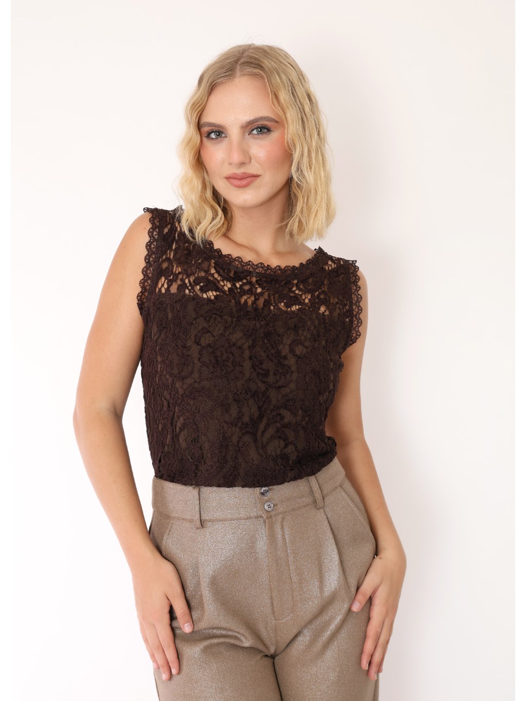 Pro elegantní, harmonický a výrazně ženský outfit zkombinujte tento čokoládový krajkový top s kalhotami ve světlejších, jemně lesklých odstínech — například champagne taupe, zlatavá mocha nebo karamelově béžová. Kontrast mezi bohatou krajkou a hladkým lesklým materiálem vytvoří luxusní kombinaci, která působí jako dokonalý večerní look v italském stylu.