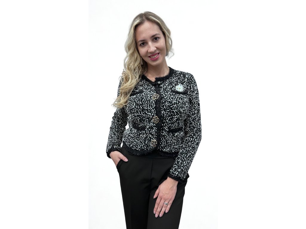 Tento mimořádně stylový boucle cardigan přináší dokonalou rovnováhu mezi elegancí, pohodlím a jemnou extravagancí. Černo-bílá texturovaná tkanina působí sofistikovaně a vytváří jedinečný vizuální efekt, který nepřehlédnete.