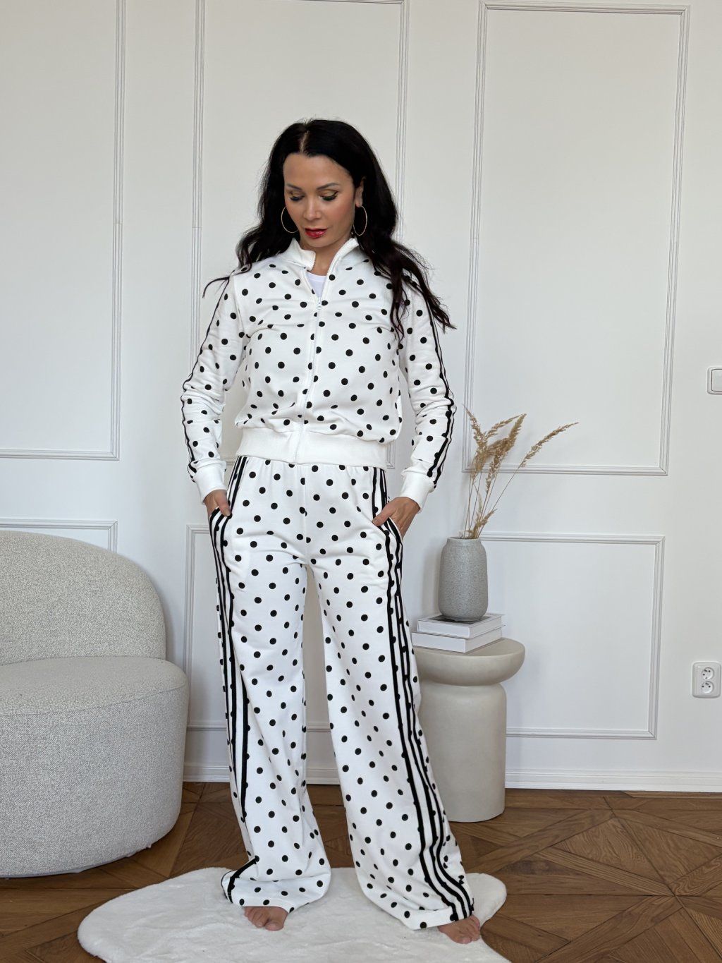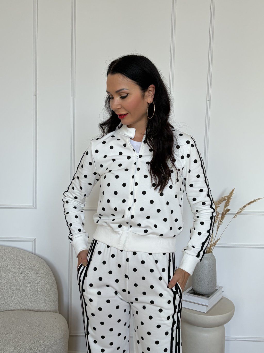 Nadčasová kombinace pohodlí a stylu v moderním provedení. Tento dvoudílný set v bílém odstínu s kontrastními černými puntíky působí svěže, čistě a zároveň velmi šik. Minimalistický základ doplňují sportovní detaily, které dodávají outfitu uvolněnou eleganci.