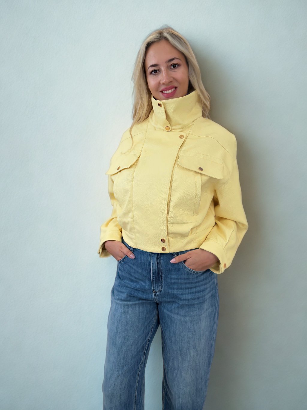 Elegantní a sebevědomá. Tato dámská bunda v jemném citronově žlutém odstínu je ztělesněním moderní lehkosti a sofistikovaného stylu. Na první pohled zaujme výrazně řešeným stojáčkem, který dodává modelu noblesní charakter a zároveň působí velmi ženským dojmem.