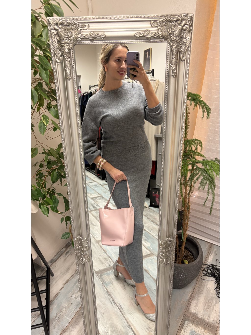 Tento sofistikovaný dvoudílný set sukně a svetříku představuje nadčasový základ šatníku inspirovaný italským smyslem pro jednoduchý luxus. Jemný pletený materiál v elegantním šedém tónu působí velmi čistě, uhlazeně a snadno se kombinuje s dalšími kousky.