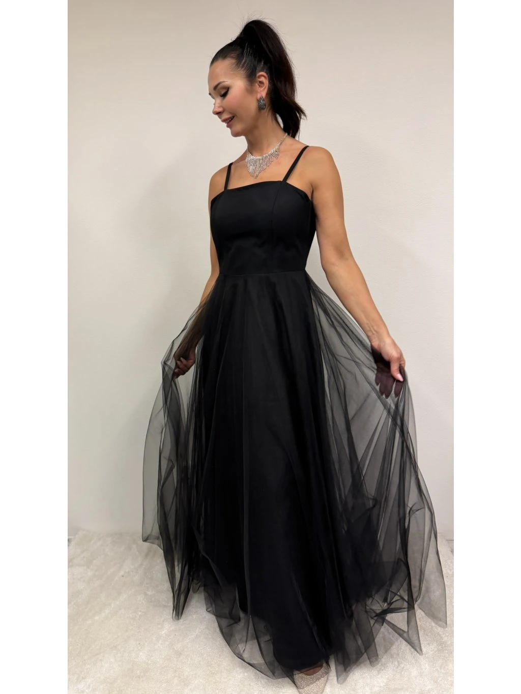 Tyto nadčasové černé šaty jsou ztělesněním jemné ženskosti a sofistikovaného večerního stylu. Minimalistický živůtek na tenká ramínka vytváří čistou, elegantní linii, která krásně zvýrazňuje ramena a dekolt. V pase se šaty jemně rozšiřují do bohaté tylové sukně, která dodává modelu lehkost, vzdušnost a romantický pohyb při každém kroku.