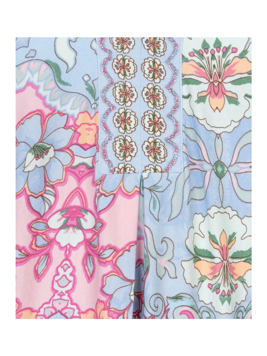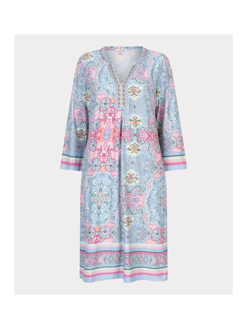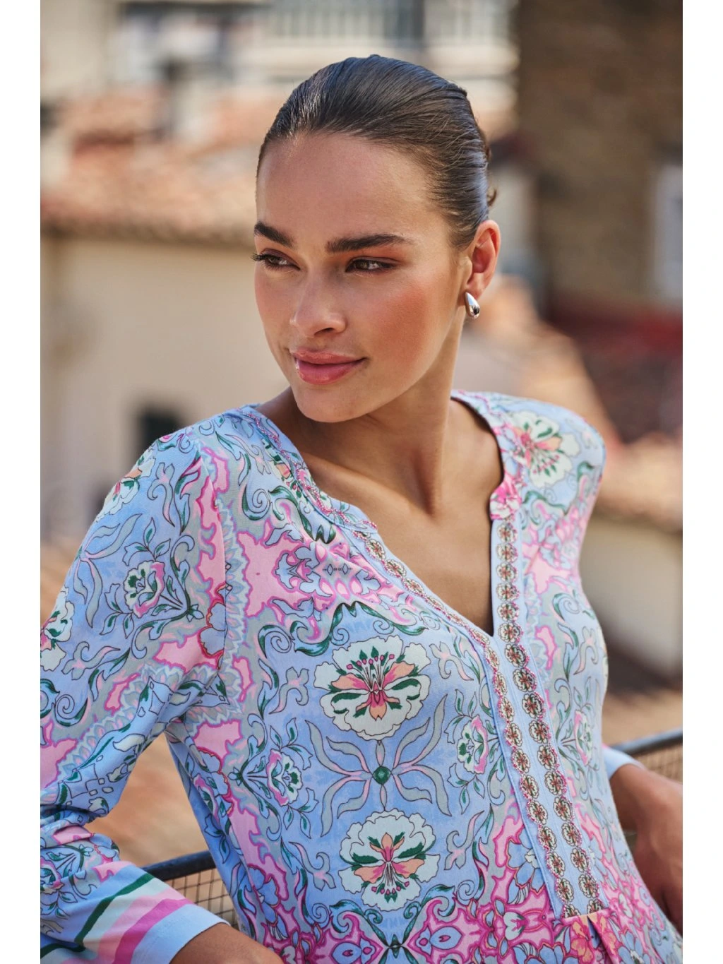 Tyto šaty jsou ztělesněním jemné ženskosti a smyslu pro detail. Na první pohled okouzlí harmonickou paletou pastelově modré a pudrově růžové, které se prolínají v bohatém, ornamentálním vzoru inspirovaném květinovými motivy a romantickou estetikou Středomoří.